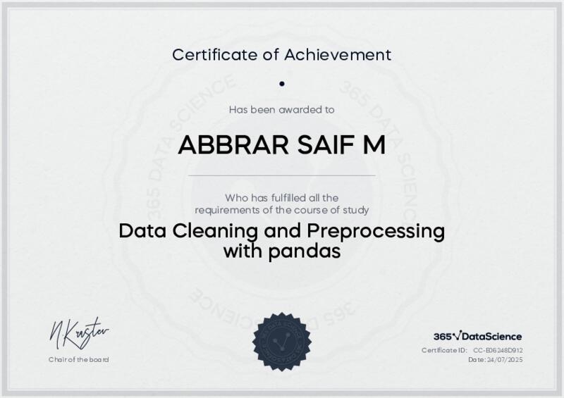 This user has been awarded the Data Cleaning and Preprocessing with pandas Certificate for successfully completing the course exam. Holding this certificate demonstrates their proficiency on the topic and signifies they are qualified to apply their newly acquired expertise in the fields of data analytics and data science.