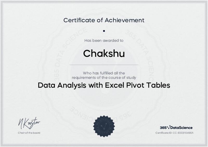 This user has been awarded the Data Analysis with Excel Pivot Tables Certificate for successfully completing the course exam. Holding this certificate demonstrates their proficiency on the topic and signifies they are qualified to apply their newly acquired expertise in the fields of data analytics and data science.
