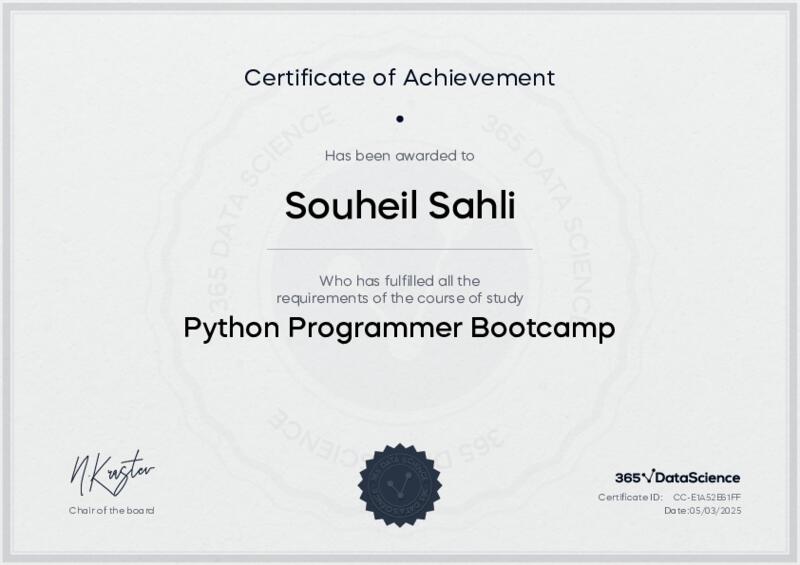 This user has been awarded the Python Programmer Bootcamp Certificate for successfully completing the course exam. Holding this certificate demonstrates their proficiency on the topic and signifies they are qualified to apply their newly acquired expertise in the fields of data analytics and data science.