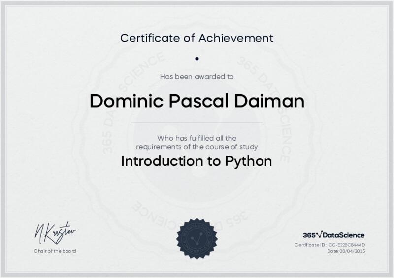This user has been awarded the Introduction to Python Certificate for successfully completing the course exam. Holding this certificate demonstrates their proficiency on the topic and signifies they are qualified to apply their newly acquired expertise in the fields of data analytics and data science.