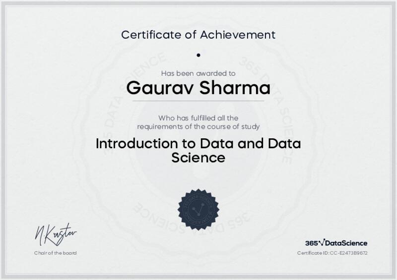 This user has been awarded the Introduction to Data and Data Science Certificate for successfully completing the course exam. Holding this certificate demonstrates their proficiency on the topic and signifies they are qualified to apply their newly acquired expertise in the fields of data analytics and data science.