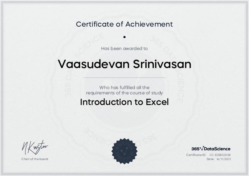 This user has been awarded the Introduction to Excel Certificate for successfully completing the course exam. Holding this certificate demonstrates their proficiency on the topic and signifies they are qualified to apply their newly acquired expertise in the fields of data analytics and data science.