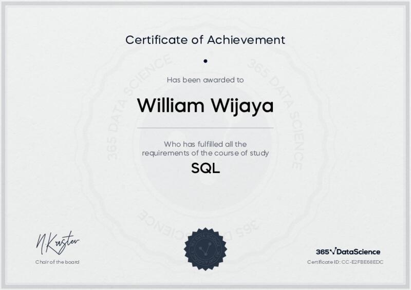 This user has been awarded the SQL Certificate for successfully completing the course exam. Holding this certificate demonstrates their proficiency on the topic and signifies they are qualified to apply their newly acquired expertise in the fields of data analytics and data science.
