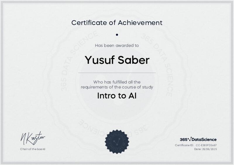 This user has been awarded the Intro to AI Certificate for successfully completing the course exam. Holding this certificate demonstrates their proficiency on the topic and signifies they are qualified to apply their newly acquired expertise in the fields of data analytics and data science.