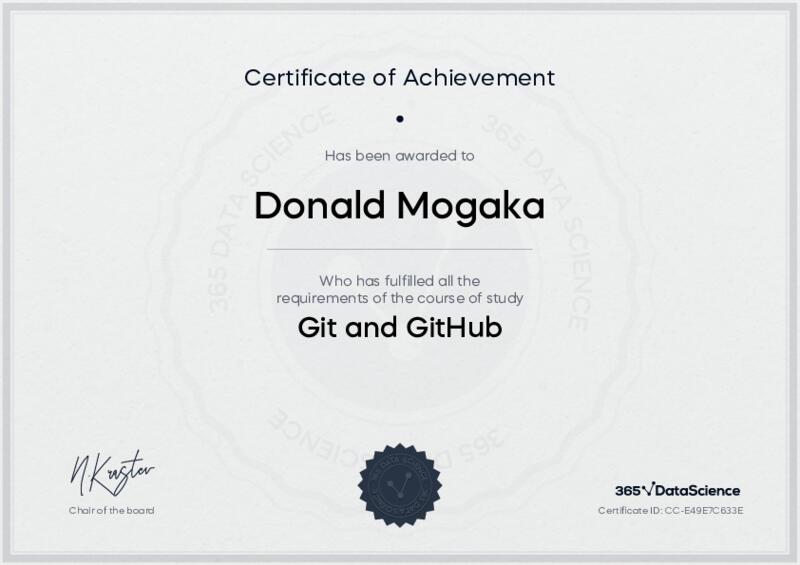 This user has been awarded the Git and GitHub Certificate for successfully completing the course exam. Holding this certificate demonstrates their proficiency on the topic and signifies they are qualified to apply their newly acquired expertise in the fields of data analytics and data science.