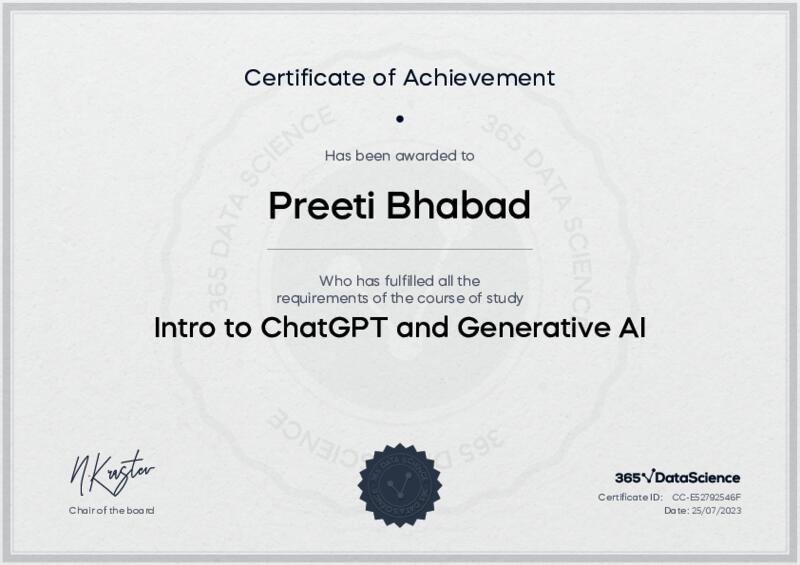 This user has been awarded the Intro to ChatGPT and Generative AI Certificate for successfully completing the course exam. Holding this certificate demonstrates their proficiency on the topic and signifies they are qualified to apply their newly acquired expertise in the fields of data analytics and data science.