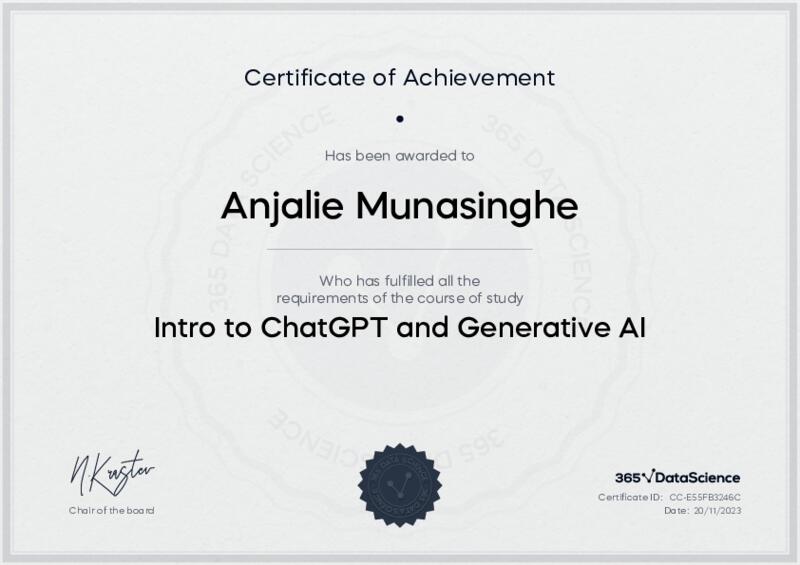 This user has been awarded the Intro to ChatGPT and Generative AI Certificate for successfully completing the course exam. Holding this certificate demonstrates their proficiency on the topic and signifies they are qualified to apply their newly acquired expertise in the fields of data analytics and data science.