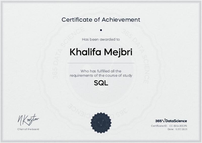 This user has been awarded the SQL Certificate for successfully completing the course exam. Holding this certificate demonstrates their proficiency on the topic and signifies they are qualified to apply their newly acquired expertise in the fields of data analytics and data science.