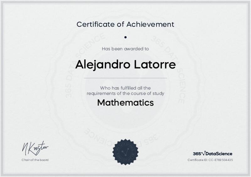 This user has been awarded the Mathematics Certificate for successfully completing the course exam. Holding this certificate demonstrates their proficiency on the topic and signifies they are qualified to apply their newly acquired expertise in the fields of data analytics and data science.
