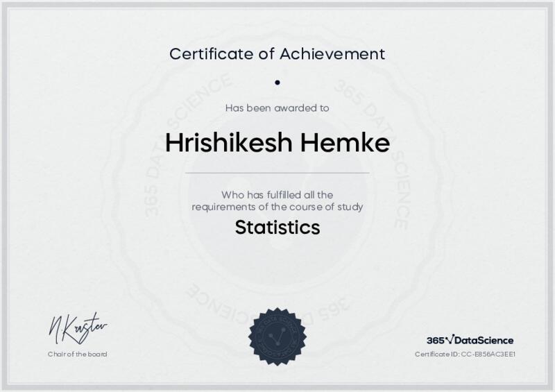 This user has been awarded the Statistics Certificate for successfully completing the course exam. Holding this certificate demonstrates their proficiency on the topic and signifies they are qualified to apply their newly acquired expertise in the fields of data analytics and data science.
