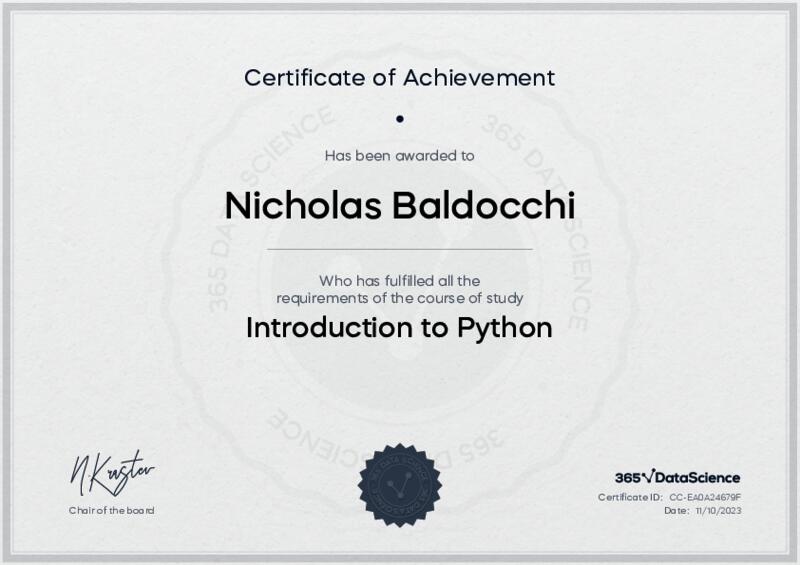 This user has been awarded the Introduction to Python Certificate for successfully completing the course exam. Holding this certificate demonstrates their proficiency on the topic and signifies they are qualified to apply their newly acquired expertise in the fields of data analytics and data science.