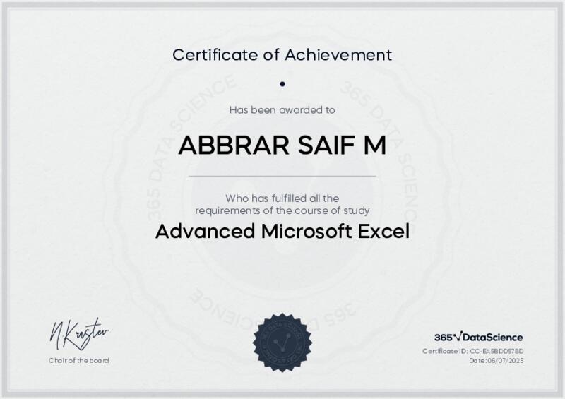This user has been awarded the Advanced Microsoft Excel Certificate for successfully completing the course exam. Holding this certificate demonstrates their proficiency on the topic and signifies they are qualified to apply their newly acquired expertise in the fields of data analytics and data science.