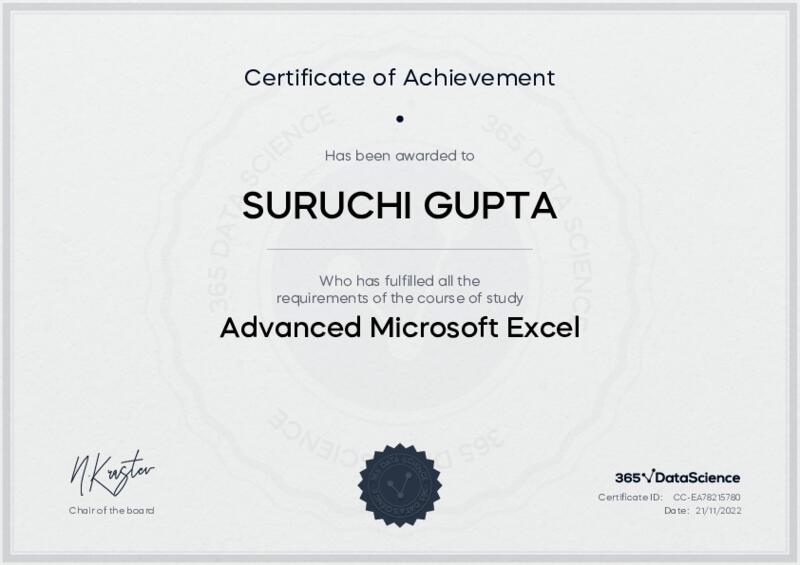 This user has been awarded the Advanced Microsoft Excel Certificate for successfully completing the course exam. Holding this certificate demonstrates their proficiency on the topic and signifies they are qualified to apply their newly acquired expertise in the fields of data analytics and data science.