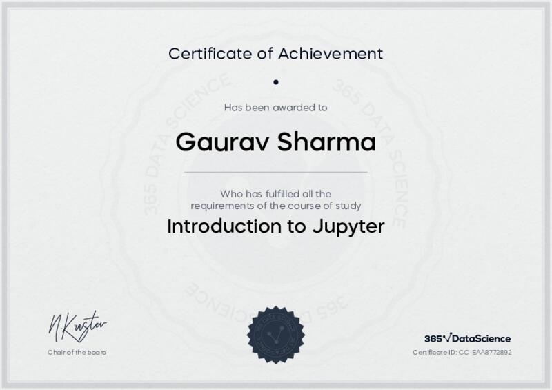 This user has been awarded the Introduction to Jupyter Certificate for successfully completing the course exam. Holding this certificate demonstrates their proficiency on the topic and signifies they are qualified to apply their newly acquired expertise in the fields of data analytics and data science.