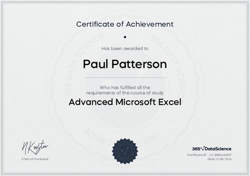 This user has been awarded the Advanced Microsoft Excel Certificate for successfully completing the course exam. Holding this certificate demonstrates their proficiency on the topic and signifies they are qualified to apply their newly acquired expertise in the fields of data analytics and data science.