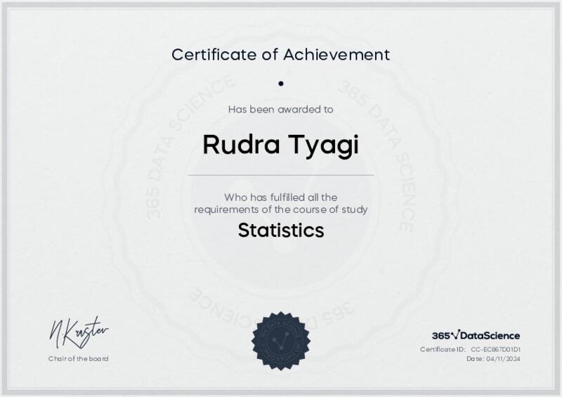 This user has been awarded the Statistics Certificate for successfully completing the course exam. Holding this certificate demonstrates their proficiency on the topic and signifies they are qualified to apply their newly acquired expertise in the fields of data analytics and data science.