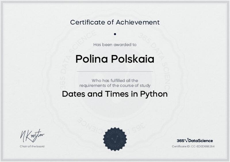 This user has been awarded the Dates and Times in Python Certificate for successfully completing the course exam. Holding this certificate demonstrates their proficiency on the topic and signifies they are qualified to apply their newly acquired expertise in the fields of data analytics and data science.