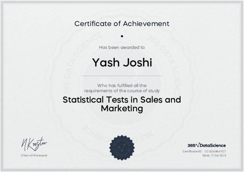 This user has been awarded the Statistical Tests in Sales and Marketing Certificate for successfully completing the course exam. Holding this certificate demonstrates their proficiency on the topic and signifies they are qualified to apply their newly acquired expertise in the fields of data analytics and data science.