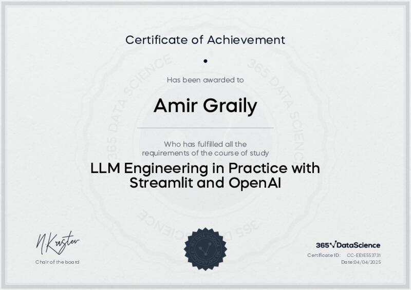 This user has been awarded the LLM Engineering in Practice with Streamlit and OpenAI Certificate for successfully completing the course exam. Holding this certificate demonstrates their proficiency on the topic and signifies they are qualified to apply their newly acquired expertise in the fields of data analytics and data science.