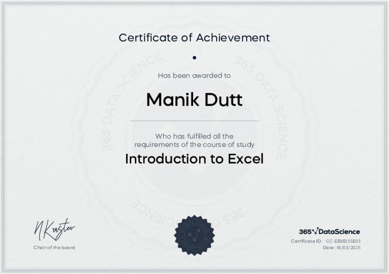 This user has been awarded the Introduction to Excel Certificate for successfully completing the course exam. Holding this certificate demonstrates their proficiency on the topic and signifies they are qualified to apply their newly acquired expertise in the fields of data analytics and data science.