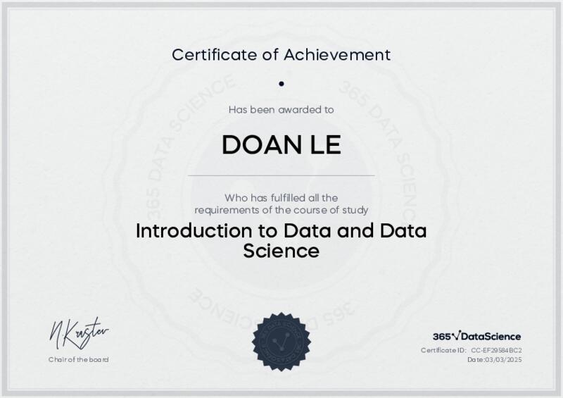 This user has been awarded the Introduction to Data and Data Science Certificate for successfully completing the course exam. Holding this certificate demonstrates their proficiency on the topic and signifies they are qualified to apply their newly acquired expertise in the fields of data analytics and data science.