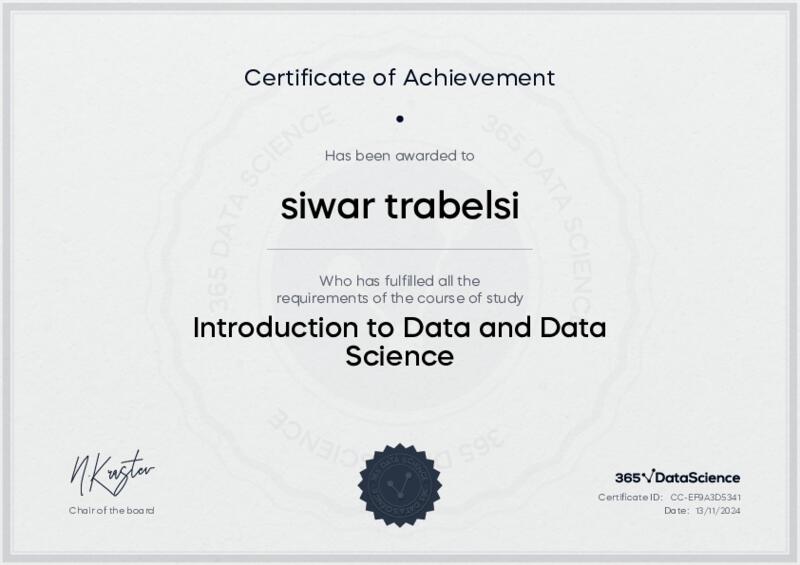 This user has been awarded the Introduction to Data and Data Science Certificate for successfully completing the course exam. Holding this certificate demonstrates their proficiency on the topic and signifies they are qualified to apply their newly acquired expertise in the fields of data analytics and data science.