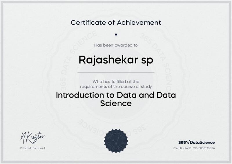This user has been awarded the Introduction to Data and Data Science Certificate for successfully completing the course exam. Holding this certificate demonstrates their proficiency on the topic and signifies they are qualified to apply their newly acquired expertise in the fields of data analytics and data science.