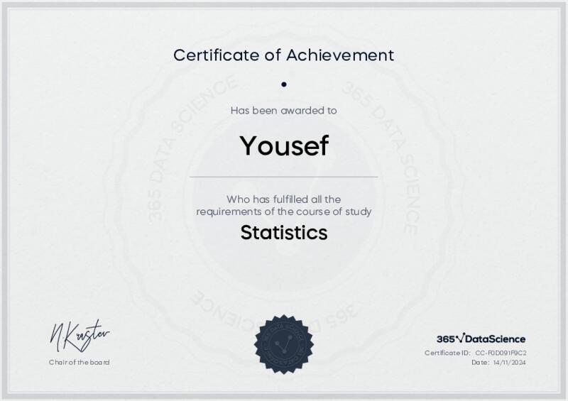 This user has been awarded the Statistics Certificate for successfully completing the course exam. Holding this certificate demonstrates their proficiency on the topic and signifies they are qualified to apply their newly acquired expertise in the fields of data analytics and data science.