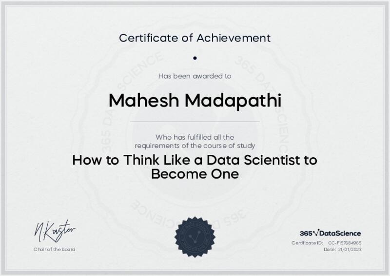 This user has been awarded the How to Think Like a Data Scientist to Become One Certificate for successfully completing the course exam. Holding this certificate demonstrates their proficiency on the topic and signifies they are qualified to apply their newly acquired expertise in the fields of data analytics and data science.