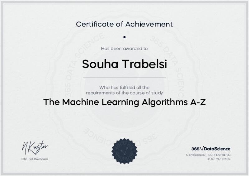 This user has been awarded the The Machine Learning Algorithms A-Z Certificate for successfully completing the course exam. Holding this certificate demonstrates their proficiency on the topic and signifies they are qualified to apply their newly acquired expertise in the fields of data analytics and data science.