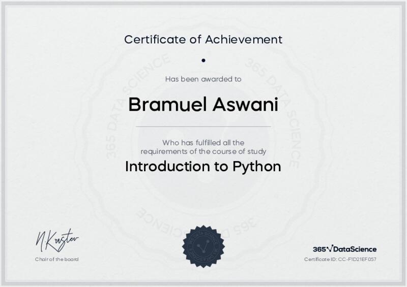 This user has been awarded the Introduction to Python Certificate for successfully completing the course exam. Holding this certificate demonstrates their proficiency on the topic and signifies they are qualified to apply their newly acquired expertise in the fields of data analytics and data science.