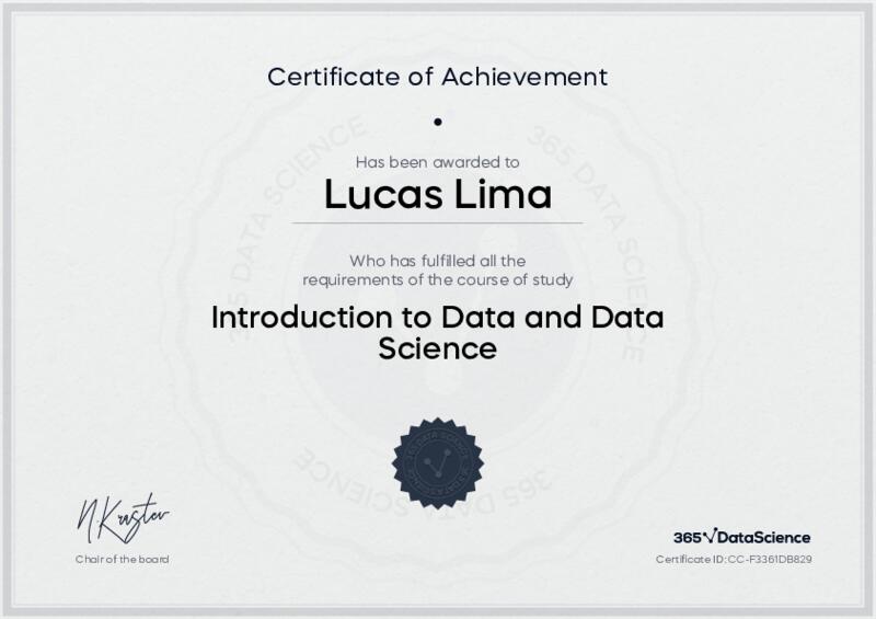 This user has been awarded the Introduction to Data and Data Science Certificate for successfully completing the course exam. Holding this certificate demonstrates their proficiency on the topic and signifies they are qualified to apply their newly acquired expertise in the fields of data analytics and data science.