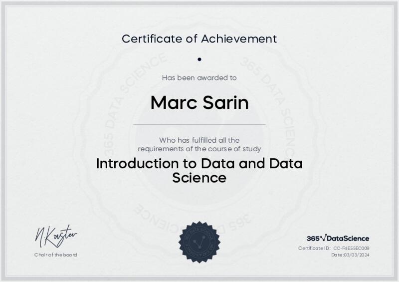 This user has been awarded the Introduction to Data and Data Science Certificate for successfully completing the course exam. Holding this certificate demonstrates their proficiency on the topic and signifies they are qualified to apply their newly acquired expertise in the fields of data analytics and data science.