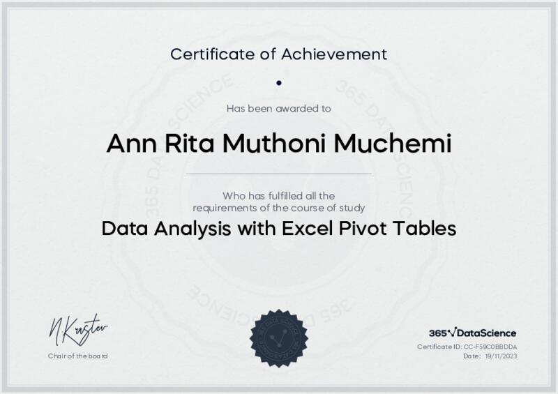 This user has been awarded the Data Analysis with Excel Pivot Tables Certificate for successfully completing the course exam. Holding this certificate demonstrates their proficiency on the topic and signifies they are qualified to apply their newly acquired expertise in the fields of data analytics and data science.