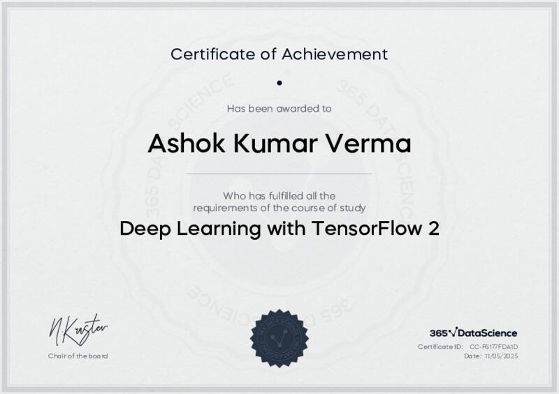 This user has been awarded the Deep Learning with TensorFlow 2 Certificate for successfully completing the course exam. Holding this certificate demonstrates their proficiency on the topic and signifies they are qualified to apply their newly acquired expertise in the fields of data analytics and data science.
