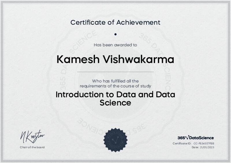 This user has been awarded the Introduction to Data and Data Science Certificate for successfully completing the course exam. Holding this certificate demonstrates their proficiency on the topic and signifies they are qualified to apply their newly acquired expertise in the fields of data analytics and data science.