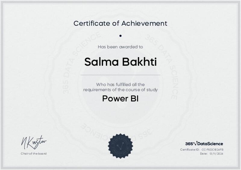 This user has been awarded the Power BI Certificate for successfully completing the course exam. Holding this certificate demonstrates their proficiency on the topic and signifies they are qualified to apply their newly acquired expertise in the fields of data analytics and data science.