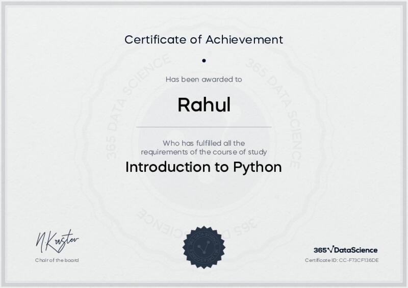 This user has been awarded the Introduction to Python Certificate for successfully completing the course exam. Holding this certificate demonstrates their proficiency on the topic and signifies they are qualified to apply their newly acquired expertise in the fields of data analytics and data science.
