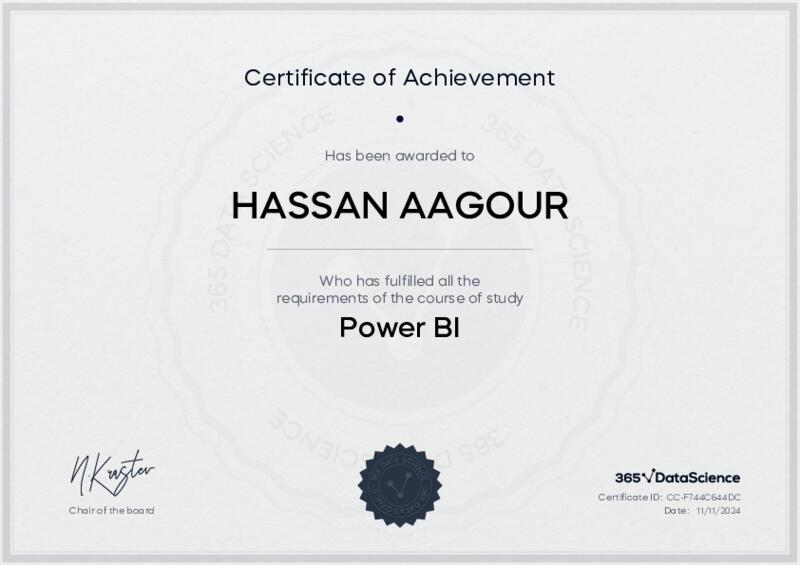 This user has been awarded the Power BI Certificate for successfully completing the course exam. Holding this certificate demonstrates their proficiency on the topic and signifies they are qualified to apply their newly acquired expertise in the fields of data analytics and data science.