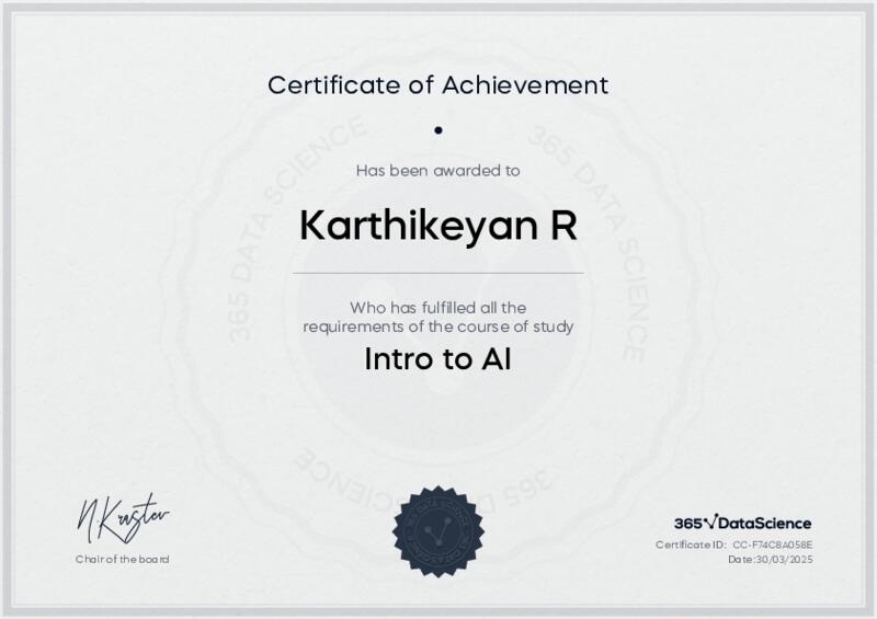 This user has been awarded the Intro to AI Certificate for successfully completing the course exam. Holding this certificate demonstrates their proficiency on the topic and signifies they are qualified to apply their newly acquired expertise in the fields of data analytics and data science.