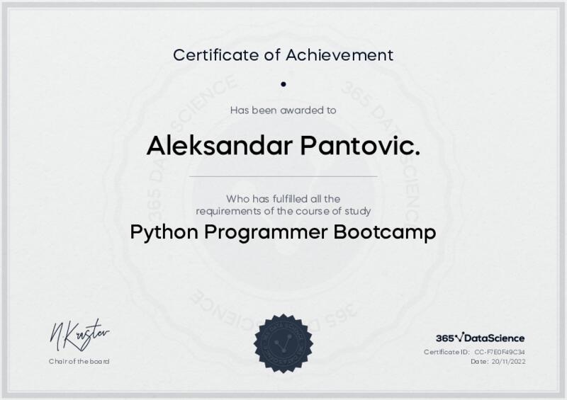 This user has been awarded the Python Programmer Bootcamp Certificate for successfully completing the course exam. Holding this certificate demonstrates their proficiency on the topic and signifies they are qualified to apply their newly acquired expertise in the fields of data analytics and data science.