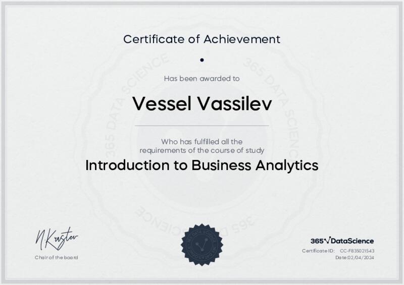 This user has been awarded the Introduction to Business Analytics Certificate for successfully completing the course exam. Holding this certificate demonstrates their proficiency on the topic and signifies they are qualified to apply their newly acquired expertise in the fields of data analytics and data science.