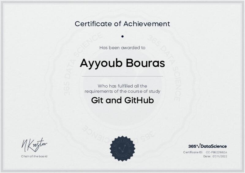 This user has been awarded the Git and GitHub Certificate for successfully completing the course exam. Holding this certificate demonstrates their proficiency on the topic and signifies they are qualified to apply their newly acquired expertise in the fields of data analytics and data science.