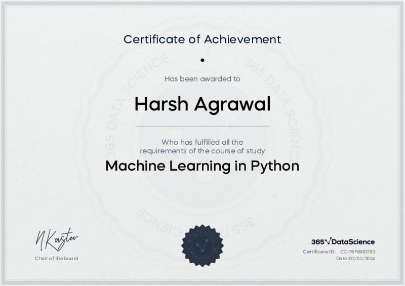 This user has been awarded the Machine Learning in Python Certificate for successfully completing the course exam. Holding this certificate demonstrates their proficiency on the topic and signifies they are qualified to apply their newly acquired expertise in the fields of data analytics and data science.