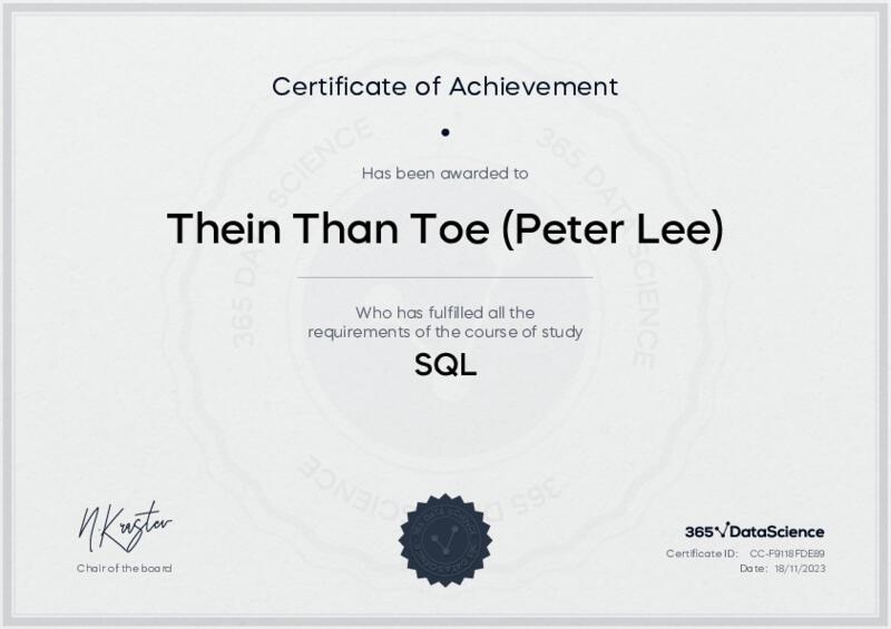 This user has been awarded the SQL Certificate for successfully completing the course exam. Holding this certificate demonstrates their proficiency on the topic and signifies they are qualified to apply their newly acquired expertise in the fields of data analytics and data science.