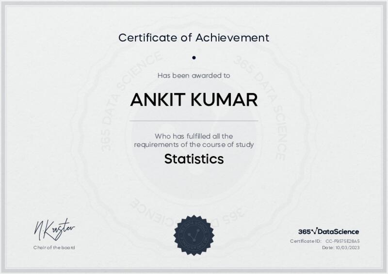 This user has been awarded the Statistics Certificate for successfully completing the course exam. Holding this certificate demonstrates their proficiency on the topic and signifies they are qualified to apply their newly acquired expertise in the fields of data analytics and data science.