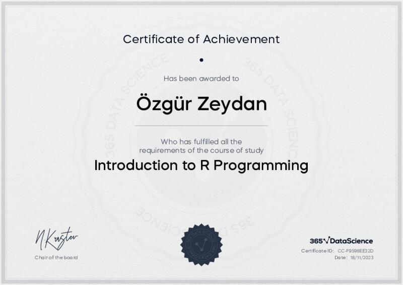 This user has been awarded the Introduction to R Programming Certificate for successfully completing the course exam. Holding this certificate demonstrates their proficiency on the topic and signifies they are qualified to apply their newly acquired expertise in the fields of data analytics and data science.