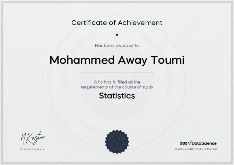 This user has been awarded the Statistics Certificate for successfully completing the course exam. Holding this certificate demonstrates their proficiency on the topic and signifies they are qualified to apply their newly acquired expertise in the fields of data analytics and data science.