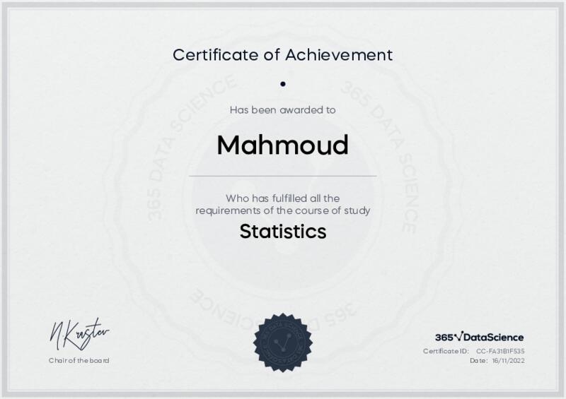 This user has been awarded the Statistics Certificate for successfully completing the course exam. Holding this certificate demonstrates their proficiency on the topic and signifies they are qualified to apply their newly acquired expertise in the fields of data analytics and data science.