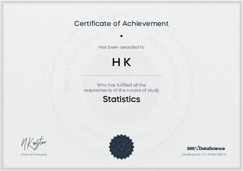 This user has been awarded the Statistics Certificate for successfully completing the course exam. Holding this certificate demonstrates their proficiency on the topic and signifies they are qualified to apply their newly acquired expertise in the fields of data analytics and data science.